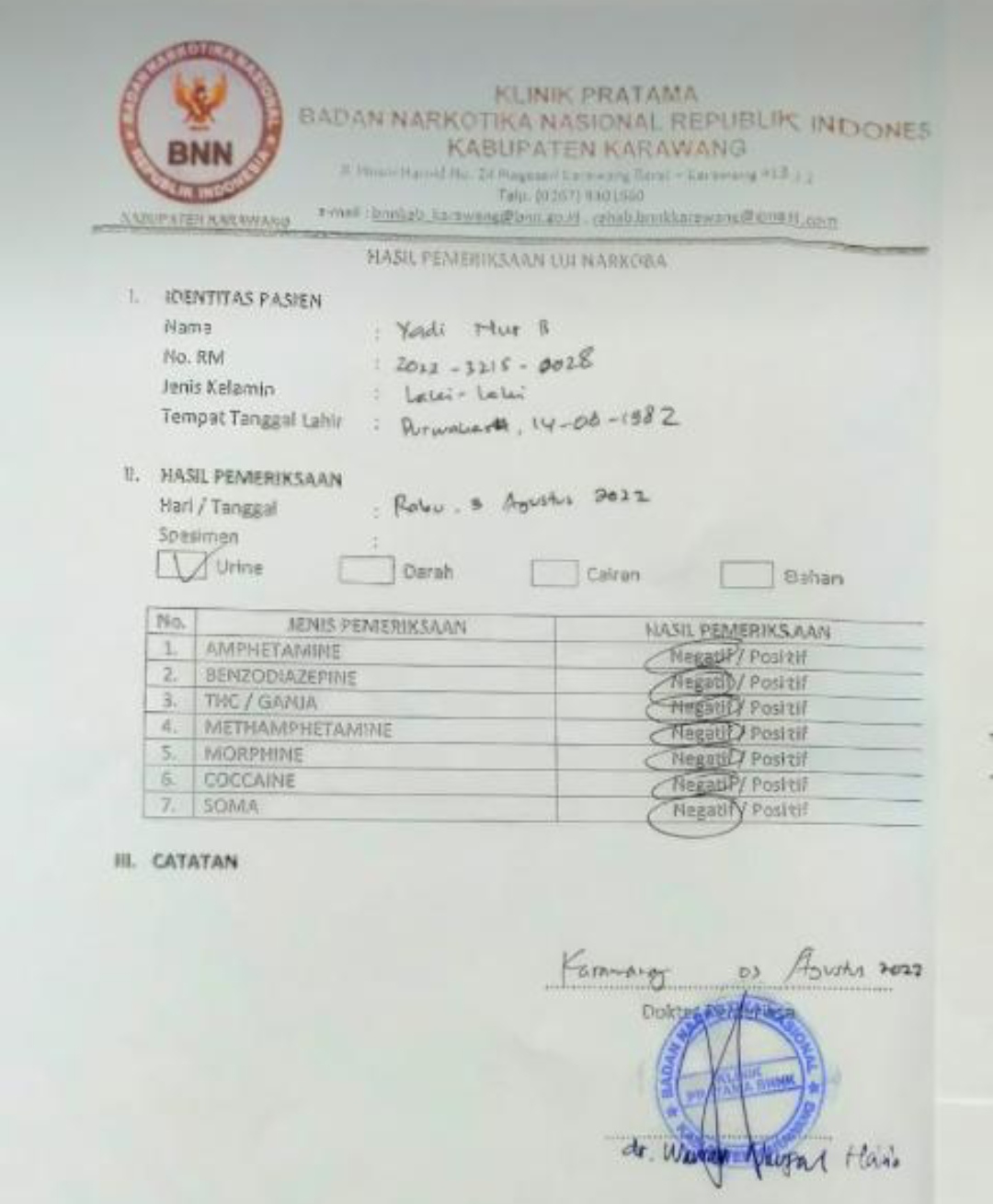 “Jadi hasil tes urine di Polres Purwakarta sebagai hasil yang utama, pemeriksaan uji narkoba di BNN Karawang dianggap tidak ada,” katanya.