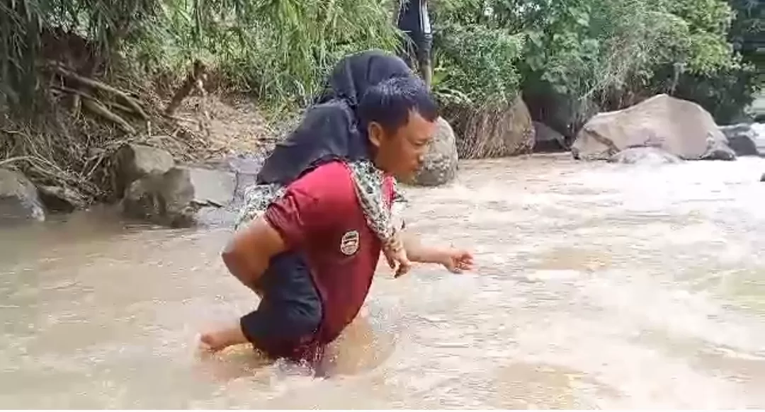Laki-laki tersebut kemudian menggendong seorang perempuan yang ingin pulang melewati sungai tersebut.
