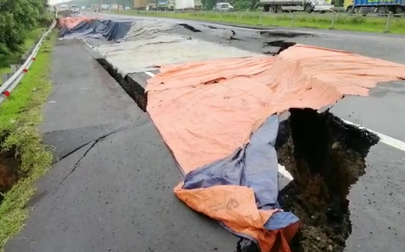 Amblesnya badan jalan itu terlihat retakan jalan cukup dalam dan patahan memakan seluruh lajur sekaligus sehingga tidak bisa dilalui kendaraan. Namun petugas sudah berada di lapangan untuk mengatur lalu lintas.