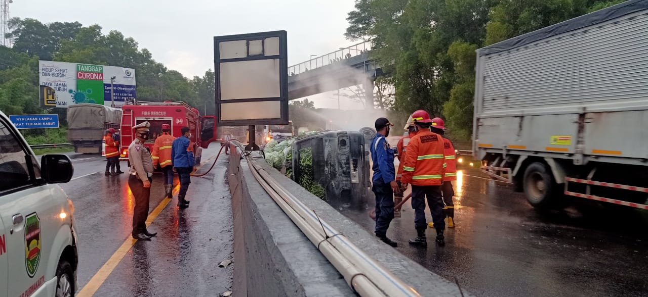 Mobil Pikap Terbalik dan Terbakar di Tol Cipularang KM 93 B