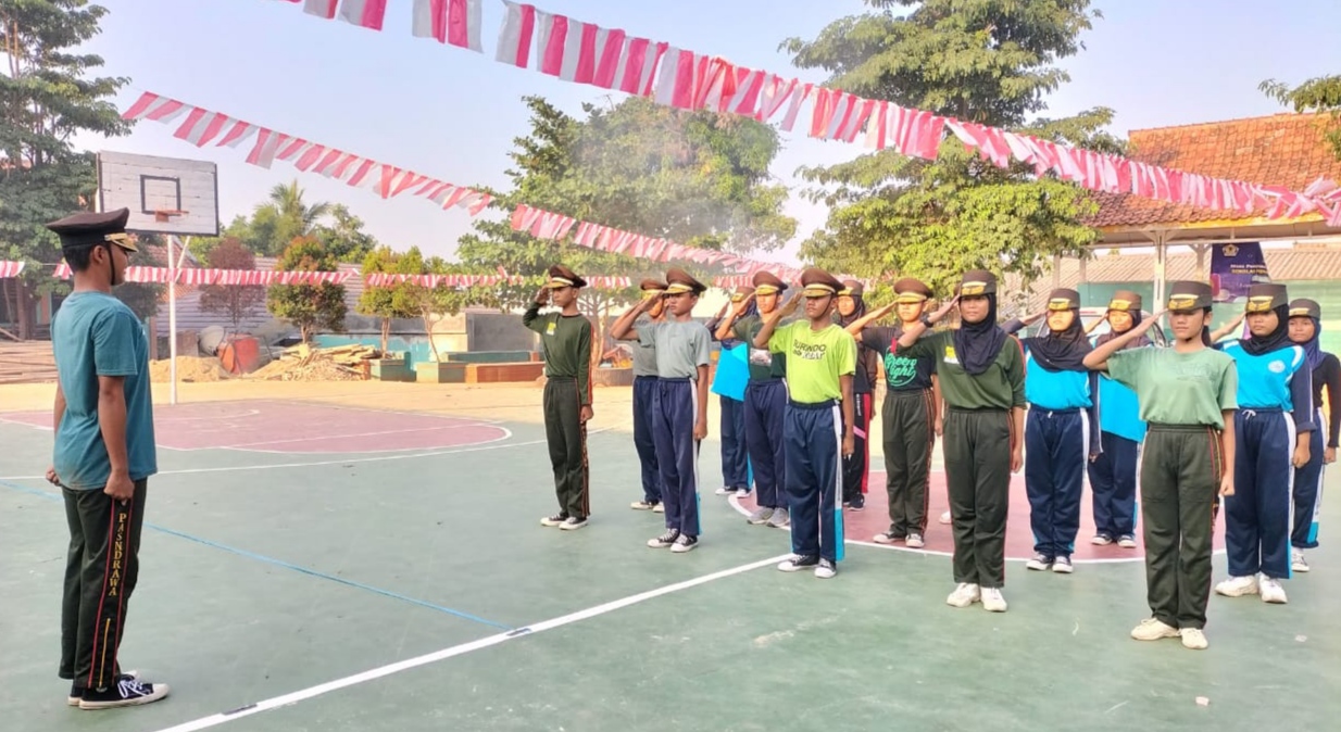 Para pelajar yang tergabung dalam ekstra kurikuler Paskibra yang sedang gencar berlatih, dan mereka menggunakan kaos dan celana olahraga, serta topi coklat.