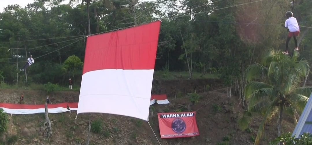 Garisjabar.com- komunitas pencinta alam membentangkan bendera merah putih berukuran besar di atas air terjun setinggi 40 meter menyambut HUT RI ke-79 Republik Indonesia.