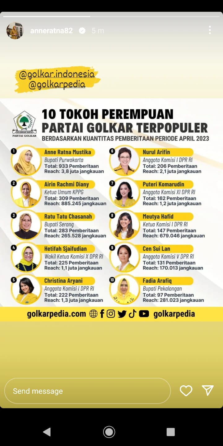 Sementara berdasar hasil riset Golkarpedia, Bupati Purwakarta Anne Ratna Mustika Menjadi yang pertama dari 10 tokoh perempuan paling populer Partai Golkar dengan indikator banyak pemberitaan 933 dan 3,8 juta jangkauan.